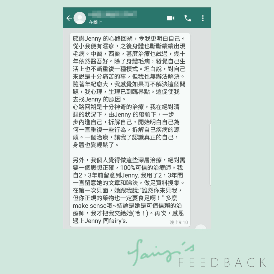 「感謝Jenny 的心路回朔,令我更明白自己。從小我便有濕疹,之後身體也斷斷續續出現毛病。中醫,西醫,甚麼治療也試過,幾十年依然醫吾好。除了身體毛病,發覺自己生活上也不斷重復一種模式。坦白說,對自己來說是十分痛苦的事,但我也無辦法解決。隨著年紀愈大,我感覺如果再不解決這個問題,我心理,生理已到臨界點。這促使我去找Jenny 的原因。