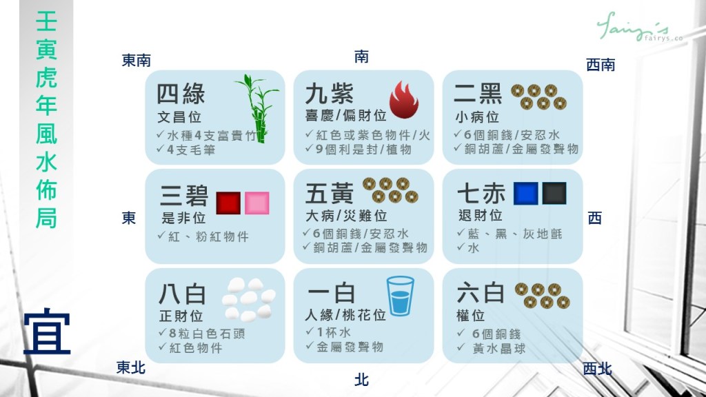 今年要特別注意中宮的災難位、西南方的小病位和東方的是非爭吵位啊~ 如無必要,少用為妙~ 真無法避開的話,就要化解了。