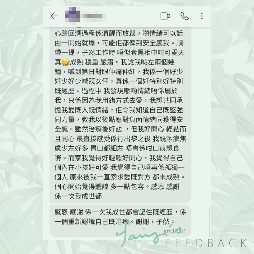 感恩 感謝 係一次我成世都會記住既經歷,係一個重新認識自己既治療。謝謝,子然。」