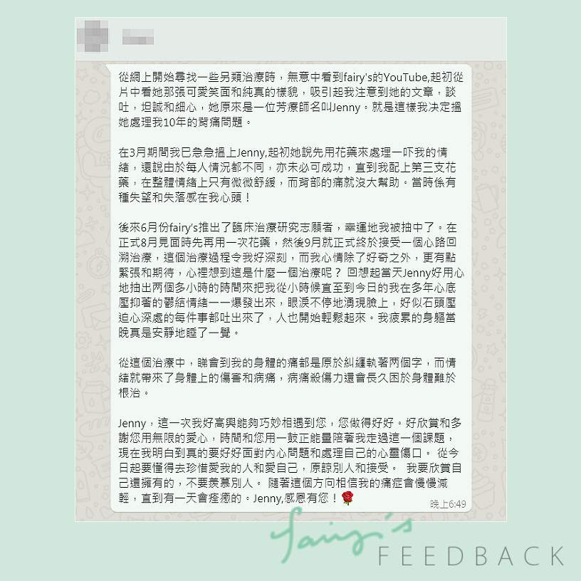 「Hi Jenny, 上次試完芳瘭之後,覺得好神奇好work, 這幾個月在工作上遇到的問題,令我喘不過氣來 …